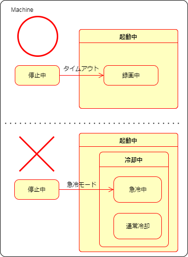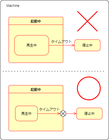 コンポジット状態には単純状態と異なる特殊な遷移がいくつかあります。使用頻度が高いと思われるのは遷移先のコンポジット状態のサブ状態へ直接遷移するタイプです。